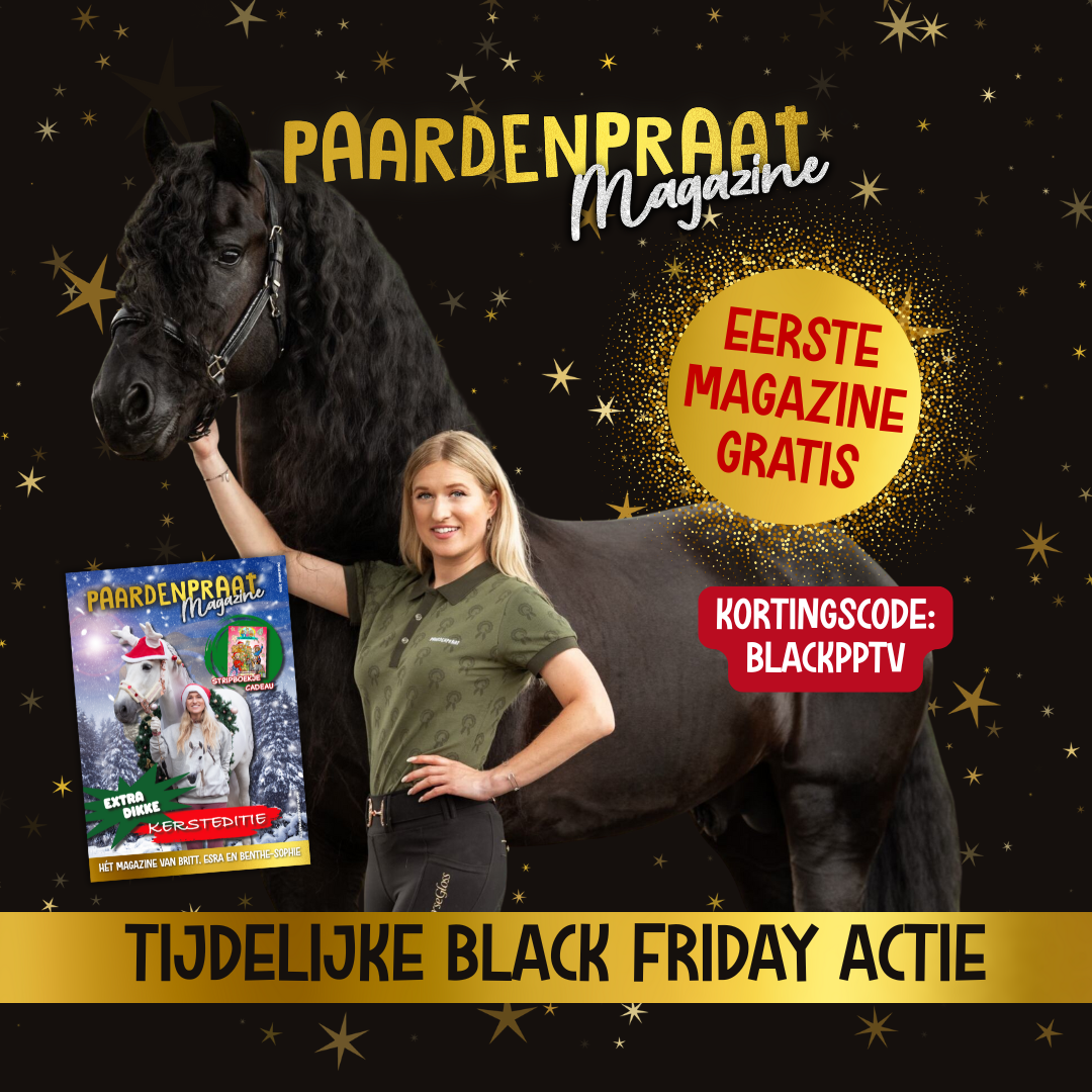 Word nu abonnee en ontvang je eerste Paardenpraat Magazine helemaal gratis! Deze actie is speciaal voor nieuwe leden en geldig t/m 1 december. Deze maand krijg je een extra dik magazine én een stripboek kado! Gebruik de code BLACKPPTV om de korting te activeren. Deze korting is niet geldig in combinatie met andere acties.